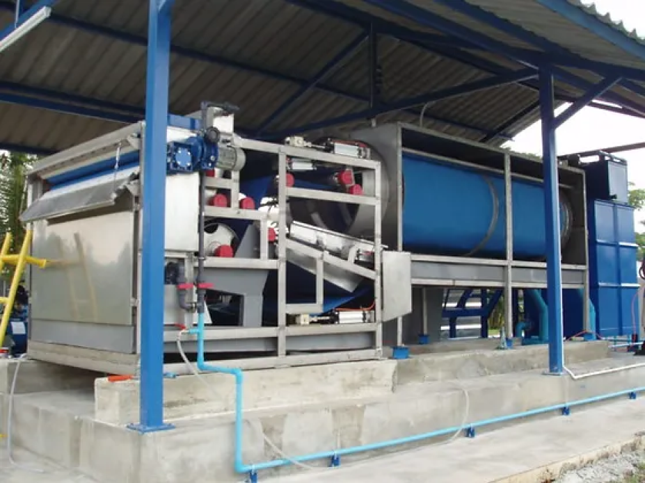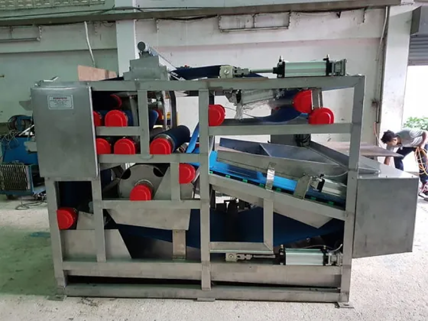 เป็นเครื่องกรองของแข็งออกจากของเหลวผ่านสายพาน (โดยทั่วไปคือโพลีเอสเตอร์) มีไว้สำหรับการแยกน้ำเชิงกลของตะกอนน้ำเสียและตะกอนปรับสภาพน้ำและน้ำตะกอนทางอุตสาหกรรม เครื่องกรองแบบสายพานถูกนำมาใช้โดยรวมในโรงบำบัดน้ำเสีย เนื่องจากมีผลผลิตและความน่าเชื่อถือสูง โดยทั่วไป กากตะกอนที่ถูกแยกออกจากน้ำผ่านสายพานจะมีปริมาณของแข็งประมาณ 18-25% ภายใต้น้ำตะกอนตั้งแต่ 0.8- 4% และปริมาณโพลีเมอร์เฉลี่ย 2-3.5 กิโลกรัม/ตันของตะกอนแห้ง ประสิทธิภาพขึ้นอยู่กับลักษณะของของแข็ง